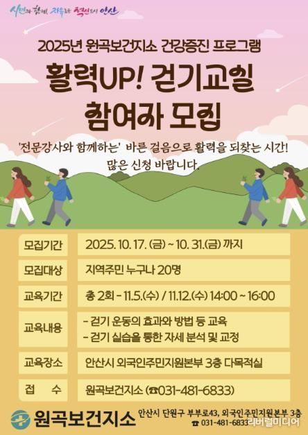 [리버럴미디어=공소리 기자] 안산시 단원보건소 원곡보건지소는 오는 31일까지 ‘맞춤형 건강 프로그램 ’활력UP! 걷기교실’ 참여자를 모집한다고 16일 밝혔다.