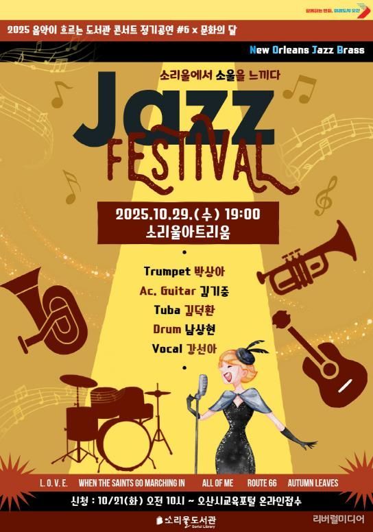 [리버럴미디어=공소리 기자] 경기도 오산시는 오는 10월 29일 오후 7시, 소리울도서관 3층 소리울아트리움에서 '2025 음악이 흐르는 도서관 콘서트 정기공연 #6 × 문화의 달 – Jazz Festival; 소리울에서 소울을 느끼다'를 개최한다고 밝혔다.