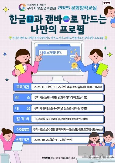 [리버럴미디어=공소리 기자] 구리시청소년재단 청소년수련관은 청소년들의 디지털 문해력 향상과 자기 표현력 강화를 위한 실습형 프로그램 '한글과 캔바로 만드는 나만의 프로필'의 참가자를 10월 20일부터 11월 2일까지 수련관 홈페이지에서 선착순 모집한다고 밝혔다.