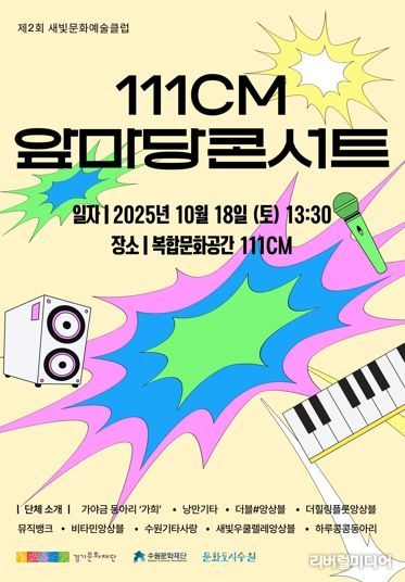 [리버럴미디어=공소리 기자] 수원문화재단은 오는 10월 18일 오후 1시 30분, 복합문화공간 111CM에서 제2회 새빛문화예술클럽 ‘111CM 앞마당 콘서트’를 개최한다.