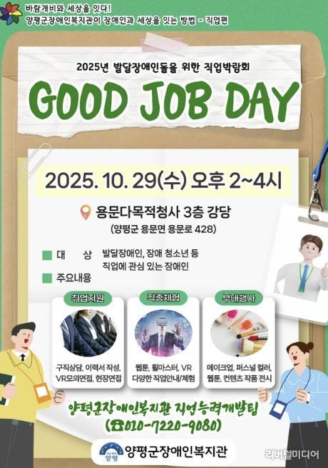 [리버럴미디어=공소리 기자] 대한불교조계종사회복지재단이 운영하는 양평군장애인복지관은 오는 29일 오후 2시부터 4시까지 용문다목적청사 3층 강당에서 발달장애인의 직업 탐색 기회를 지원하기 위한 직업박람회 ‘GOOD JOB DAY’를 개최한다.