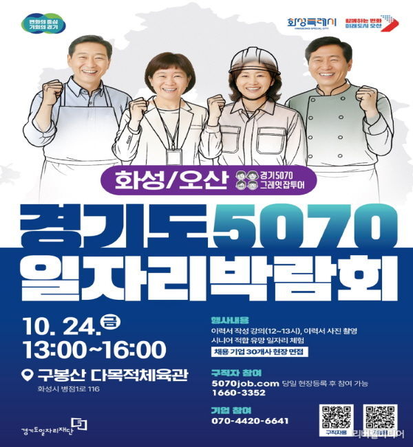 [리버럴미디어=공소리 기자] 경기도와 경기도일자리재단은 오는 10월 24일, 구봉산 다목적체육관에서 중장년층을 위한 『2025 경기도 5070 일자리박람회 in 화성+오산』를 개최한다고 밝혔다.