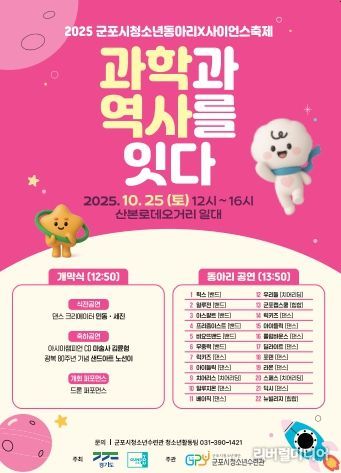[리버럴미디어=공소리 기자] (재)군포시청소년재단 산하 군포시청소년수련관은 오는 10월 25일 12시부터 16시까지 산본로데오거리 일대에서 2025 군포시청소년동아리X사이언스축제 ‘과학과 역사를 잇다’를 펼친다. 청소년들에게 공연과 과학, 역사 체험의 기회를 제공하고 지역사회의 참여를 끌어내겠다는 취지이다.