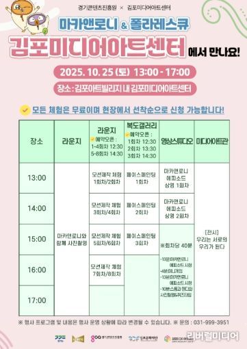 이번 행사는 사전 신청 없이 누구나 무료로 참여할 수 있으며, 자세한 사항은 김포문화재단 홈페이지를 참고하거나 김포미디어아트센터팀에 문의하면 된다.