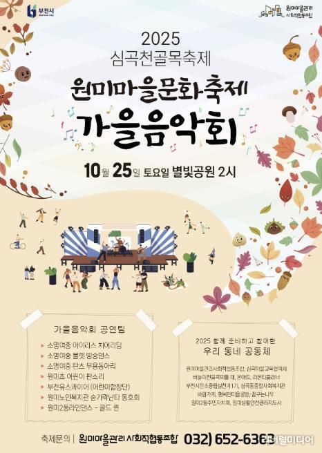 [리버럴미디어=공소리 기자] 부천시는 10월 25일 원미별마루와 별빛공원 일대(부천로 90번길 51)에서 ‘2025년 심곡천 골목축제–원미마을문화축제 가을 음악회’를 연다. 이번 행사는 부천시 원도심재생과가 주최하고, 원미마을관리사회적협동조합이 주관한다.