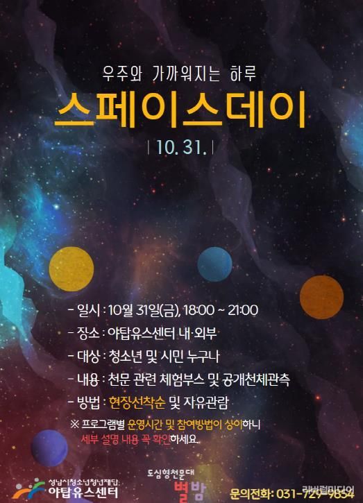 [리버럴미디어=공소리 기자] 성남시청소년청년재단 야탑유스센터는 10월 31일 오후 6시부터 9시까지 청소년과 시민을 대상으로 우주·천문을 주제로 행사 ‘스페이스데이(SPACE DAY)’를 연다고 밝혔다.