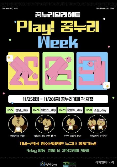 [리버럴미디어=공소리 기자] 의왕시청소년재단 산하 의왕시청소년수련관 꿈누리카페(▲고천점( 문화공원로 33), ▲내손점(복지로 109), ▲오전점(찬우물길 11), ▲백운밸리점(백운중앙로 74, 총 4개 지점))는 오는 11월 25일부터 28일까지 4일간 꿈누리딜라이트 『Play! 꿈누리 Week』를 진행한다고 밝혔다.