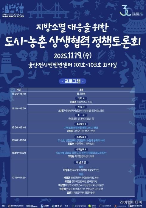 수원특례시(시장 이재준)는 11월 19일 오후 4시 울산전시컨벤션센터 1층에서 ‘지방소멸 대응을 위한 도시–농촌 상생협력 정책토론회’를 개최한다.