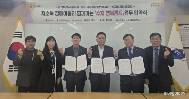 [리버럴미디어=공소리 기자] 용인특례시 수지구는 13일 용인시수지장애인복지관과 수지신용협동조합과 함께 저소득 장애아동의 복지 향상과 장애 인식 개선을 위한 ‘수지 행복캠프’ 추진 업무협약을 체결했다고 14일 밝혔다.