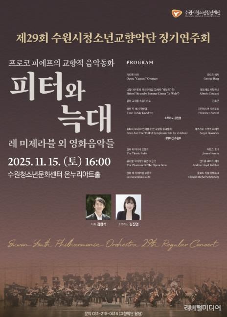 [리버럴미디어=공소리 기자] 수원시청소년청년재단 수원청소년문화센터에서는 오는 11월 15일 오후4시, 온누리아트홀에서 제29회 정기연주회를 개최한다. 이번 연주회는 ‘프로코 피에프의 교향적 음악동화 '피터와 늑대'’를 중심으로, 세대를 아우르는 감동의 영화음악을 함께 선보이며 청소년 단원들의 풍성한 음악적 성장을 보여줄 예정이다.