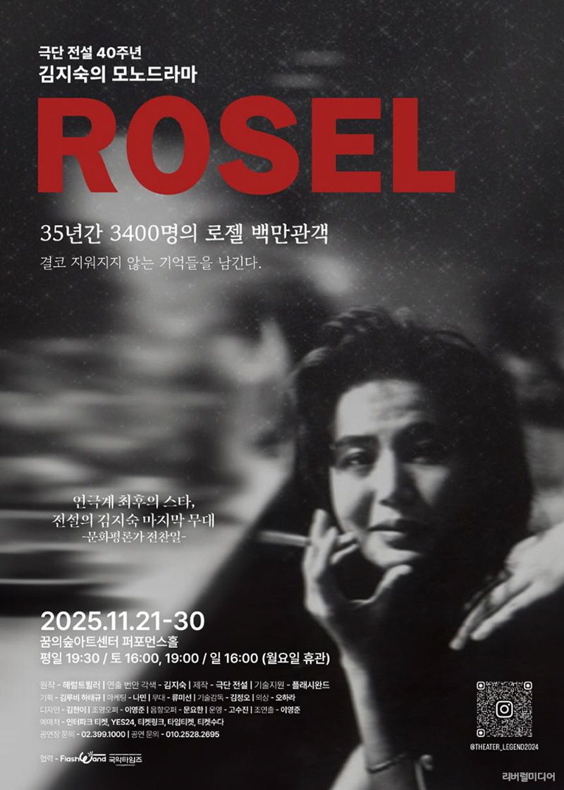 [리버럴미디어=공소리 기자] 극단 전설 40주년 기념작이자 배우 김지숙의 마지막 공연인 모노드라마 〈로젤〉이 오는 11월 21일부터 30일까지 꿈의숲아트센터 퍼포먼스홀에서 막을 올린다. 35년간 3,400회 이상 공연되며 백만 명이 넘는 관객을 울린 이 작품은 여성의 주체성과 인간성의 회복을 그린 한국 연극사의 대표작으로 꼽힌다.