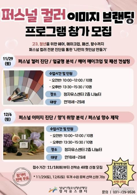 [리버럴미디어=공소리 기자] 성남시청소년청년재단 정자유스센터는 고등학교 3학년 및 청년(만18세~29세)을 대상으로 자신에게 어울리는 색과 향을 찾아 첫인상을 설계하는 퍼스널 컬러 이미지 브랜딩 프로그램을 11월 29일과 12월 6일에 진행한다고 밝혔다.