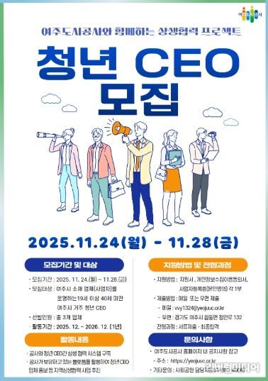 이번 모집은 여주시 소재 업체를 운영하고 있는 19세 이상 40세 미만의 청년 CEO를 대상으로 하며, 총 3개 업체를 선발할 예정이다. 선정된 청년 CEO는 오는 12월부터 내년 12월까지 1년간 공사와 함께 다양한 협력 활동에 참여하게 된다.