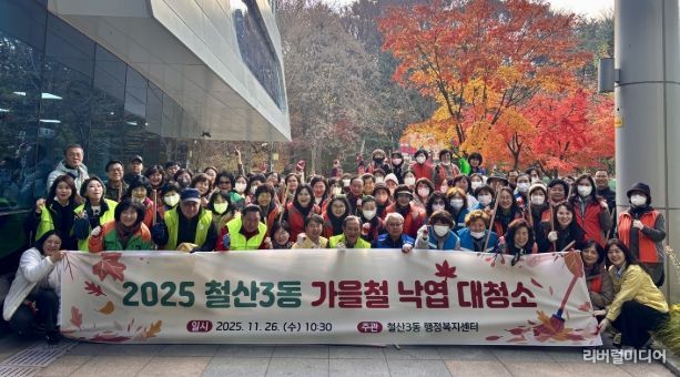 [리버럴미디어=공소리 기자] 광명시 철산3동 행정복지센터는 26일 가을철을 맞아 9개 유관단체 단체원과 직원, 지역 주민 등 100여 명이 참여한 가운데 빗물받이 주변과 길거리 낙엽을 정리하는 대청소를 실시했다.