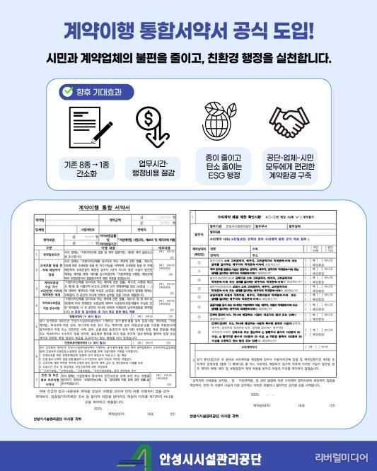 [리버럴미디어=공소리 기자] 안성시시설관리공단은 계약 절차 간소화와 행정효율성 강화를 위해 '계약이행통합서약서'를 공식 도입·시행한다고 밝혔다.