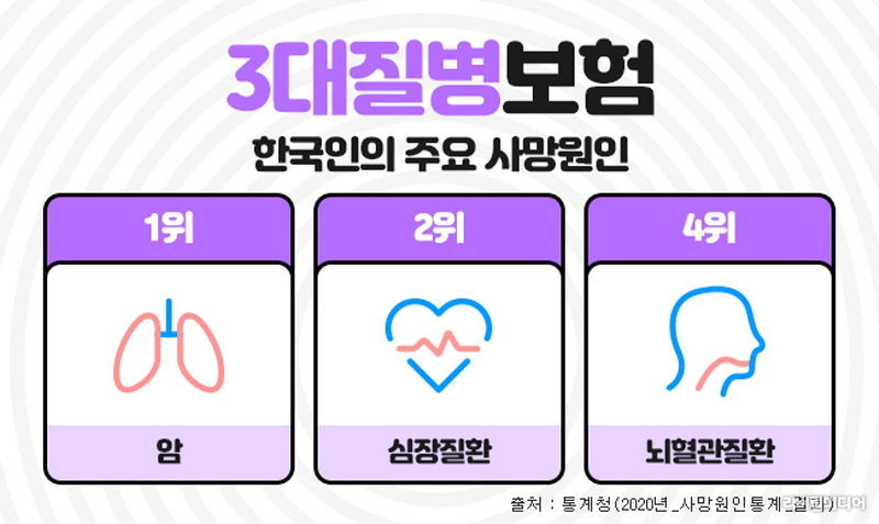[리버럴미디어=공소리 기자] 한국인의 주요 사망원인중에 암, 뇌혈관질환, 심혈관질환은 흔히 3대질병이라 일컬어지며 살아가면서 가장 먼저 대비해야 하는 중대질병으로 항상 강조되고 있다. 이들 질병에 미리 대비하기 위해 가입하는 것이 진단비보험인데, 이러한 3대질병진단비를 중점으로 보장하는 보장성보험이 3대진단비보험 이다. 3대질병진단비보험은 각각의 질병에 주목해서 보장하기도 하지만, 나에게 맞는 추가 특약을 잘 골라서 가입한다면 종합건강보험으로도 충분히 활용도가 높다.