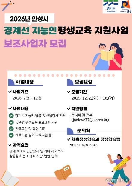 [리버럴미디어=공소리 기자] 안성시는 관내 경계선 지능인의 진단·학습·가족 지원을 체계화하고 포용적 학습환경을 조성하기 위해 12월 2일부터 16일까지'2026년 경계선 지능인 평생교육 지원사업'을 수행할 보조사업자를 공모한다.
