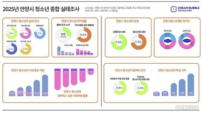 [리버럴미디어=공소리 기자] 안양시청소년재단은 5일 관내 초등학교 4학년부터 고등학교 3학년까지 재학 중인 청소년 2,782명과 학교 밖 청소년 53명을 대상으로 실시한 ‘2025년 안양시 청소년 종합 실태조사’ 결과를 발표했다.