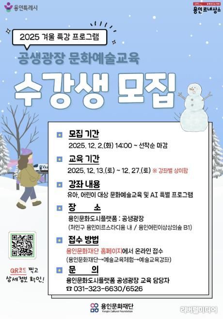 [리버럴미디어=공소리 기자] 용인문화재단은 지난 12월 2일부터 '2025 용인문화도시플랫폼 공생광장 문화예술교육' 겨울 특강 수강생을 모집하고 있다. 이번 겨울 특강은 AI 프로그램 활용 교육을 포함해 총 12개의 인기 강좌로, 겨울방학 기간 유아·어린이들이 창의력을 마음껏 발휘할 수 있는 특별한 문화예술 체험 기회를 제공한다.