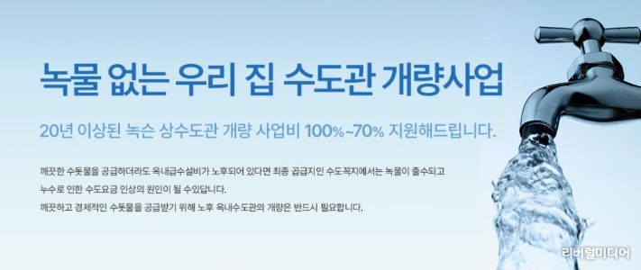 지원 대상은 녹물 발생이나 수압 저하 등으로 생활 불편을 겪고 있는 가구 중, ▲사용승인 후 20년 이상 지난 공동주택·단독주택·다가구주택 ▲연면적 130㎡ 이하 주택을 동시에 만족하는 경우에 해당한다.