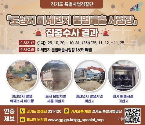 [리버럴미디어=공소리 기자] 경기도는 도심지 미세먼지 발생사업장 330개를 대상으로 불법 배출 행위를 집중 수사해 대기환경보전법 위반 사업장 16개를 적발했다고 9일 밝혔다.