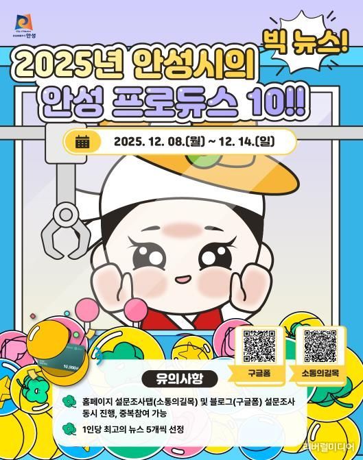 시 관계자는 “2025년 안성이 이뤄낸 의미 있는 변화들은 시민 여러분의 관심과 성원이 있었기에 가능했다”며 “한 해를 마무리하는 시점에 시민분들이 생각하는 ‘올해 안성의 대표 뉴스’ 선정에 많은 참여를 부탁드린다”고 밝혔다.
