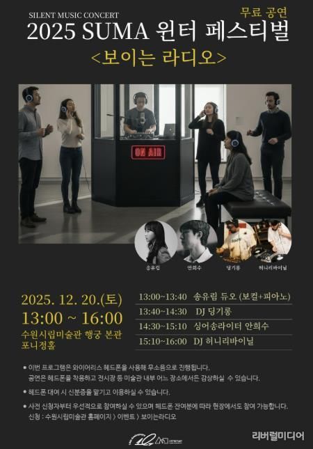 [리버럴미디어=공소리 기자] 경기도 수원시립미술관은 연말을 맞아 시민들에게 다양한 문화 체험 기회를 위한 2025 SUMA 윈터 페스티벌 '뮤지엄 라디오'를 12월 20일 오후 1시부터 4시까지 수원시립미술관 행궁 본관 로비에서 개최한다.
