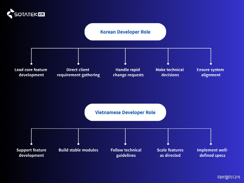 최근 국내 IT 업계에서는 한국 개발자와 베트남 개발자 간의 역할 분담이 더욱 명확해지는 추세다. 한국 개발자들은 핵심 기능 개발을 주도하며, 고객사로부터 요구사항을 직접 수집해 신속하게 대응하는 역할을 맡고 있다. 또한 기술적 의사결정을 수행하고 시스템의 전체적인 방향성을 관리하는 등 프로젝트의 전략적 중심축을 담당한다.
