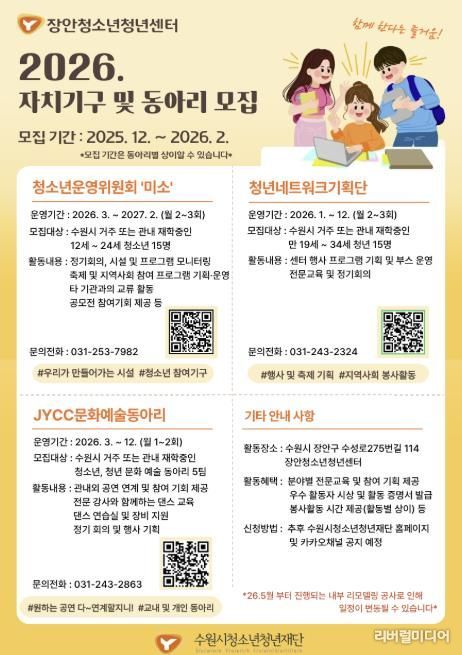 장안청소년청년센터 관계자는“2026년은 스스로 기획하고 실행하는 과정에서 성장할 수 있도록 이끌고, 청소년과 청년이 함께 움직이며 더 큰 지역 변화를 만드는데 중점을 두겠다.”라고 설명했다.