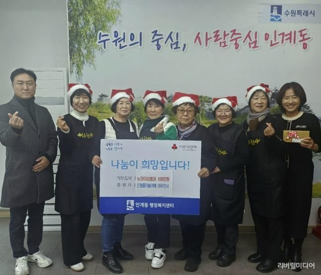 [리버럴미디어=공소리 기자] 지난 12월 15일, 수원시 팔달구 인계동은 마을 카페 ‘여우천사’에서 동 행정복지센터에 뉴코아상품권(총 100만 원 상당)을 기탁했다고 밝혔다.
