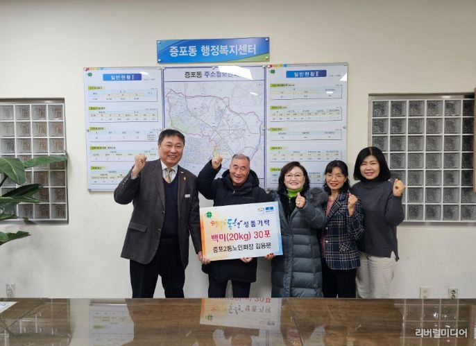 [리버럴미디어=공소리 기자] 이천시 증포동은 지난 12월 19일 증포동행정복지센터에서 증포2통 노인회 김용문 회장이 관내 취약계층을 위해 백미(20kg) 30포를 기탁했다고 밝혔다.