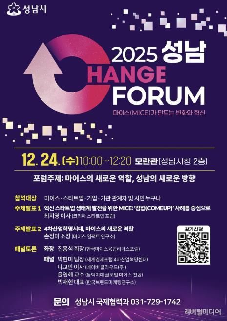 [리버럴미디어=공소리 기자] 성남시는 오는 12월 24일 오전 10시 성남시청 모란관에서 ‘2025 성남 체인지 포럼(CHANGE Forum)’을 개최한다.