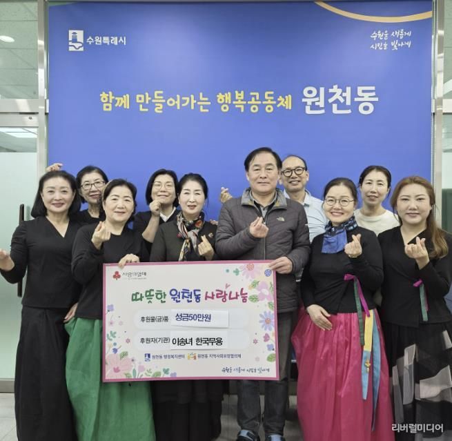 [리버럴미디어=공소리 기자] 지난 19일 한국무용반 강사 이송녀와 수강생들이 저소득 주민들을 돕기 위해 성금 50만 원을 원천동행정복지센터에 전달했다.