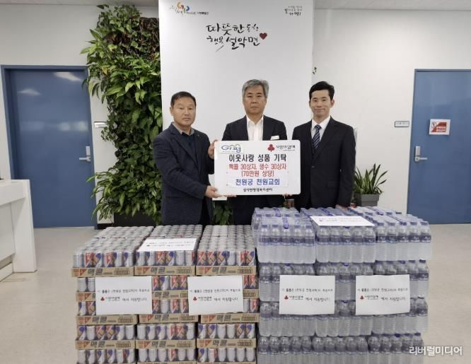 [리버럴미디어=공소리 기자] 천원궁 천원교회 권순구 교구장 외 임원진은 최근 가평군 설악면 행정복지센터를 방문에 이웃돕기 성품으로 맥콜 30상자와 생수 30상자를 기탁했다.