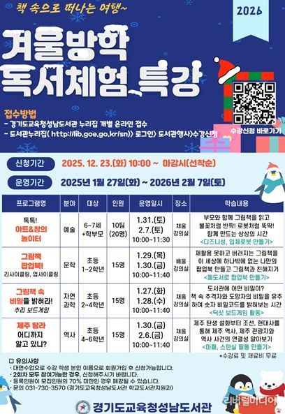 ‘겨울방학 독서교실과 겨울방학 독서체험 특강’의 참가자는 23일부터 경기도교육청성남도서관 누리집을 통해 선착순으로 모집한다.