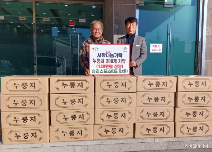 [리버럴미디어=공소리 기자] 장호원읍은 지난 22일, 승리스포츠(대표 강상율)가 누룽지 200개를 기탁했다고 밝혔다.