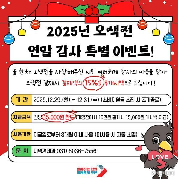 [리버럴미디어=공소리 기자] 오산시는 한 해 동안 지역화폐를 이용해 준 시민들에게 감사의 뜻을 전하고, 연말 소비 활성화를 도모하기 위해 ‘2025년 오색전 연말 감사 특별 이벤트’를 추진한다.
