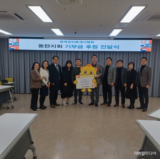 [리버럴미디어=공소리 기자] 화성특례시는 한국공인중개사협회 화성동탄지회(초록·중앙·리베라·호수·청계회 포함)에서 24일 화성시 동탄출장소를 방문해 어려운 이웃을 돕기 위한 기부금 619만 원을 기탁했다고 밝혔다.