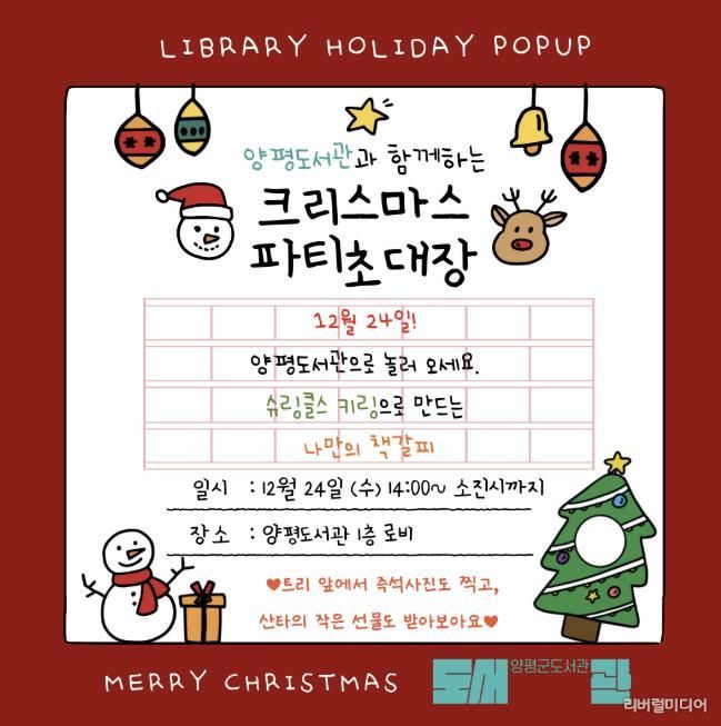이경희 평생학습과장은 “이번 크리스마스 체험행사를 통해 도서관이 지역 주민이 함께 문화를 즐기는 생활문화 공간으로 자리매김하고 있음을 확인했다”며 “앞으로도 다양한 문화 프로그램을 통해 군민의 문화 향유 기회를 지속적으로 확대하겠다”고 말했다.