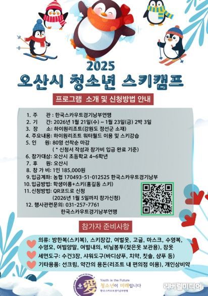이권재 오산시장은 “이번 겨울 스키캠프는 청소년들이 자연 속에서 다양한 체험활동을 통해 협동심과 도전정신을 기를 수 있는 소중한 기회가 될 것”이라며, “앞으로도 청소년의 건강한 성장과 건전한 여가활동을 지원하는 체험형 프로그램을 지속적으로 확대해 나가겠다”고 말했다.