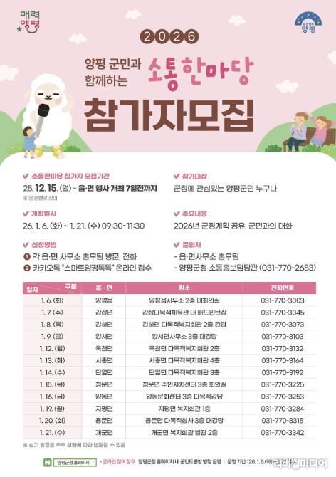 한편, ‘2026년 군민과 함께하는 소통한마당’은 △6일 양평읍 △7일 강상면 △8일 강하면 △9일 양서면 △12일 옥천면 △13일 서종면 △14일 단월면 △15일 청운면 △16일 양동면 △19일 지평면 △20일 용문면 △21일 개군면 순으로 개최된다.