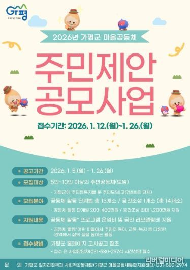 [리버럴미디어=공소리 기자] 가평군이 주민 주도의 마을공동체 활성화를 위해 ‘2026년 가평군 마을공동체 주민제안 공모사업’을 추진한다.