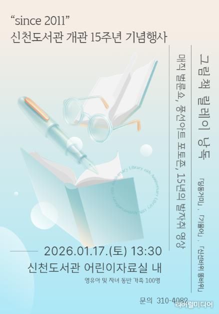 [리버럴미디어=공소리 기자] 시흥시는 오는 1월 17일 신천도서관에서 ‘개관 15주년 기념행사’를 열고, 유아동 및 어린이 동반 가족 100여 명을 대상으로 그림책 낭독과 마술 공연을 운영한다. 행사는 이날 오후 1시 30분부터 3시 30분까지 진행된다.