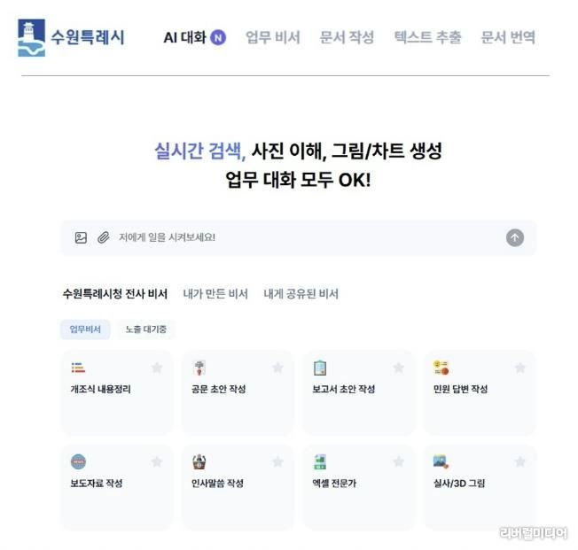[리버럴미디어=공소리 기자] 수원특례시가 생성형 인공지능(AI)을 행정 전반에 활용하기 위해 12일 공직자를 대상으로 ‘수원 인공지능(AI) 업무 비서’ 서비스를 개시했다.