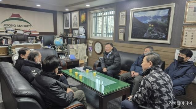 [리버럴미디어=공소리 기자] 황규돈 신임 팔달구청장은 지난 12일, 관내 전통시장을 방문해 최극렬 지동 상인회장을 비롯한 주요 임원진들과 함께 첫 공식 인사 자리를 갖고, 지역경제 활성화와 전통시장 현안에 대해 의견을 나누는 시간을 가졌다.
