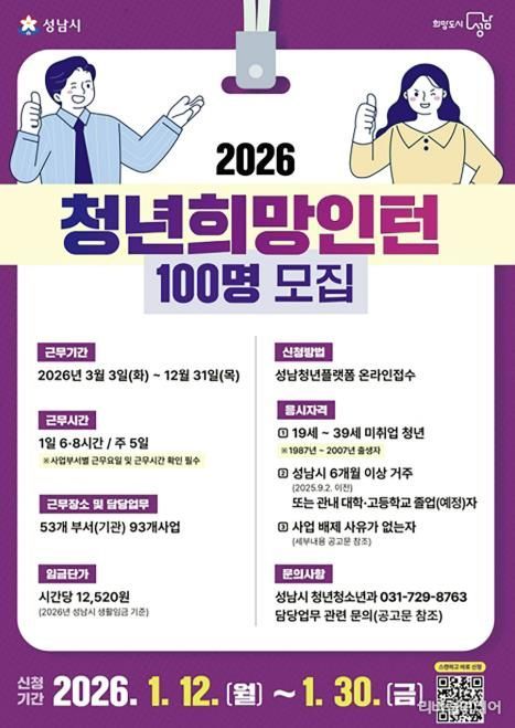 [리버럴미디어=공소리 기자] 성남시는 오는 1월 30일까지 ‘청년 희망 인턴 사업’ 참여자 100명을 모집한다.