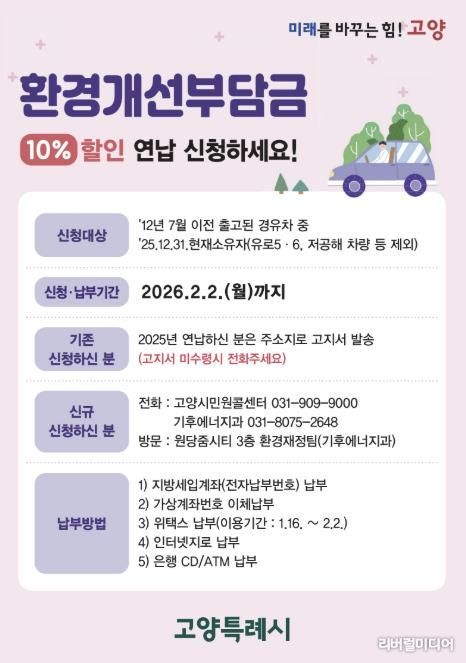 [리버럴미디어=공소리 기자] 고양특례시는 노후 경유차 소유자를 대상으로 한 ‘2026년도 환경개선부담금 연납 제도’를 운영하며 오는 2월 2일까지 신청받는다고 밝혔다.