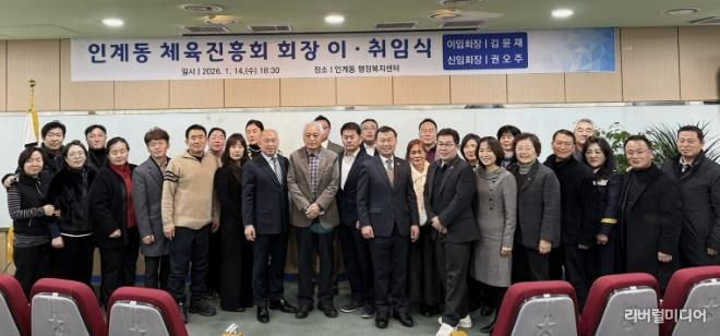 [리버럴미디어=공소리 기자] 수원시 팔달구 인계동 체육진흥회는 지난 14일, 인계동 행정복지센터에서 주요 내빈과 관계자 등 50여 명이 참석한 가운데 ‘인계동 체육진흥회장 이‧취임식’을 성황리에 개최했다.