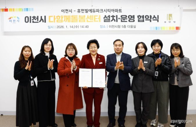 [리버럴미디어=공소리 기자] 이천시는 지난 14일 시청에서 휴먼빌에듀파크시티아파트와 단지 내 ‘다함께돌봄센터 설치·운영을 위한 업무 협약’을 체결했다고 밝혔다. 이날 협약식에는 이도아 입주자 대표회의 회장을 비롯한 관계자들이 참석했다.