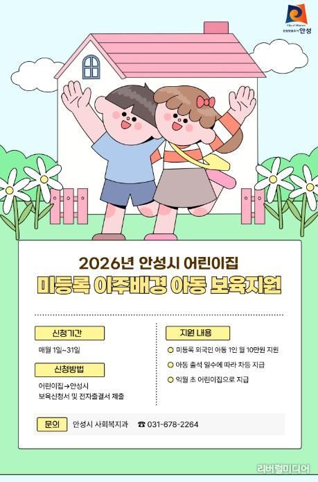 [리버럴미디어=공소리 기자] 안성시는 2026년부터 어린이집에 다니는 미등록 외국인(이주배경) 영유아에게 월 10만원의 보육지원금을 지원한다고 밝혔다.